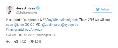 来自西班牙的José Andrés是一名明星厨师,他也宣布会关闭5个店面。Andrés本人卷入了与特朗普在华盛顿的特朗普国际酒店的一宗官司。特朗普控告他无故退出租赁餐厅的协议,要求赔偿损失。José Andrés则认为特朗普的反种族言论伤害了他。Andrés预计当天会损失10万美元,但这是一次感受“自豪”和“被赋权”的机会,很多底层的人有了一次发声的机会。