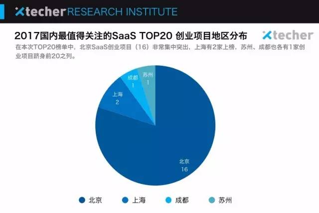 从地区分布上看,在本次TOP20榜单中,北京SaaS创业项目(16)非常集中突出,上海有2家上榜,苏州、成都也各有1家创业项目跻身前20之列。