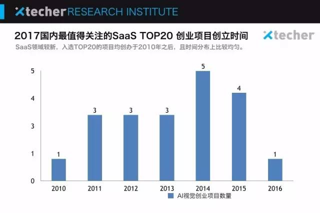 从创立时间上看,SaaS领域较新,入选TOP20的项目均创办于2010年之后,且时间分布上比较均匀。