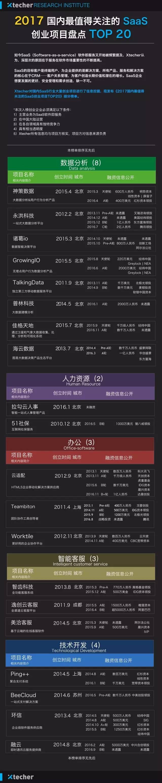 Xtecher发布的《2017国内最值得关注的SaaS创业项目TOP20》细分榜单对于我们了解国内SaaS项目有着很大的参考意义。