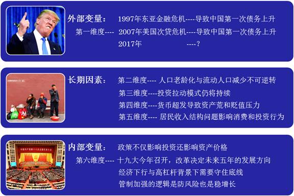 “六个维度”的第一个维度:外生变量,也就是我们通常所说的外部环境,和我们本次年会的主题“从特朗普到十九大”是相契合的,因为今年外部最大变量就是特朗普新政,而“十九大”则是我们的内生变量,也是今年我国最大的政治经济事件,决定了我国未来五年经济、政治等整个社会发展方向。