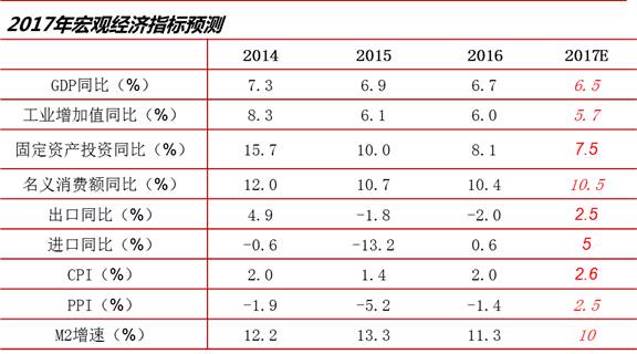通过对以上六个维度的分析,我们认为,2017年经济增速仍会继续下行,但下行幅度应该不大,总体来看,美欧日经济已走出金融危机的泥潭,增长率恢复至2005年时水平,而国内稳增长政策的力度会继续加大,估计全年GDP增速在6.5%左右。
