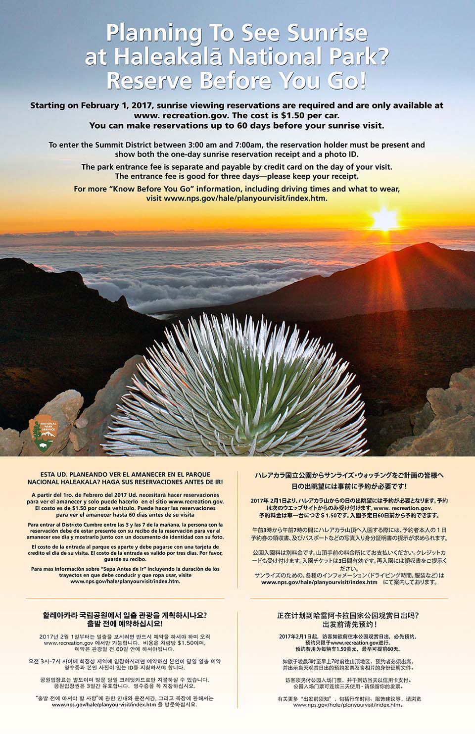 在官网预定日期之后只能在指定日期的凌晨3:00-7:00进入公园,每天日出只有150个名额,其中120个会提前两个月放出,30个是给提前一天预定的游客准备的。一般在提前半个月左右前120个会订满,所以提前确定行程很重要。后30个也会在夏威夷时间下午4点准时放出。