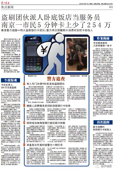 去年10月11日,有媒体发布了这样一条报道盗刷团伙派人卧底饭店当服务员,从一位南京市民银行卡上盗刷 254 万。
