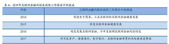 十二届全国人大五次会议是“互联网金融”连续第四年被写进政府工作报告,今年政府工作报告提出,对不良资产、债券违约、影子银行、互联网金融等累积风险要高度警惕,要“整顿规范金融秩序”。从“促进”到“异军突起”再到“规范”,直至2017年的“高度警惕风险”,政府工作报告中关于互联网金融的表示,从鼓励、规范发展到严格监管,风向的转变是渐进的。