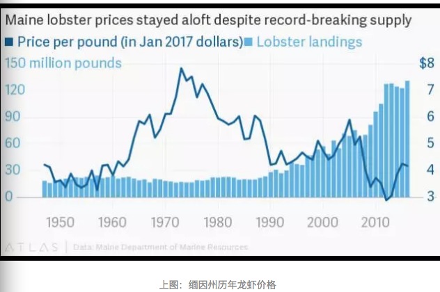 不过捕捞量过高也未必是件好事,2012年,缅因州捕获了1.26亿磅的龙虾,随后龙虾价格迅速下跌,从平常每磅8美元的零售价暴跌至1.25美元每磅,甚至比熟食肉还要便宜。这让缅因州的人们非常担忧,因为盈亏平衡点大约在每磅4美元,而龙虾产业总值约为17亿美元,占缅因州总GDP的3%。