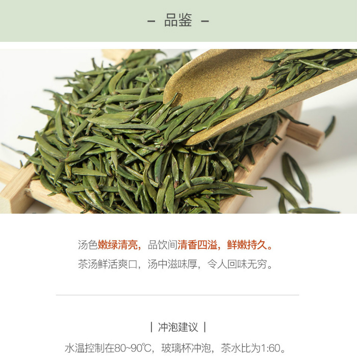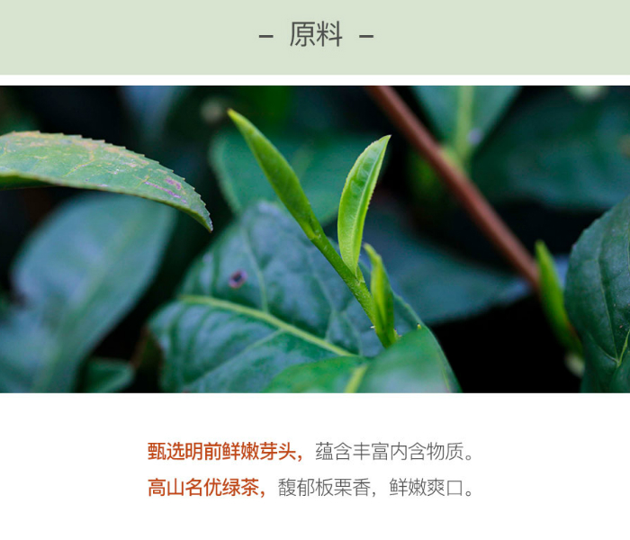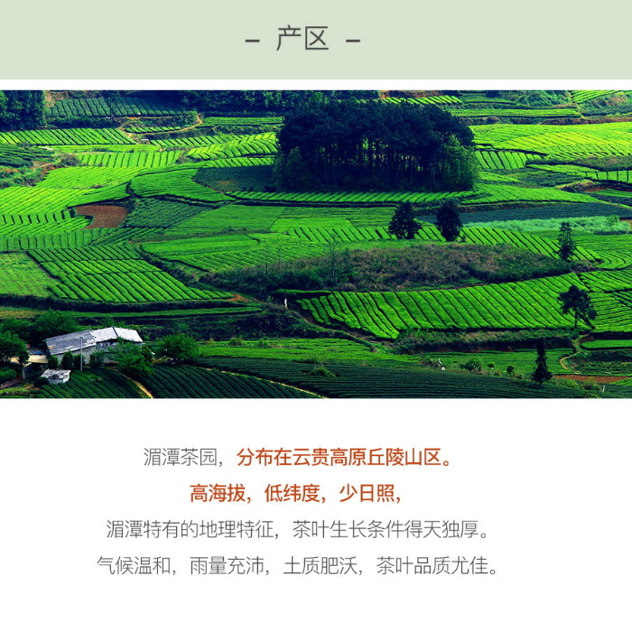贵州湄潭,曾为现代茶叶科研和种植推广中心之一,茶文化历史悠久。高海拔,低纬度,少日照,茶叶生长条件得天独厚。此为贵州湄潭云贵高原茶园明前茶,内含物质丰富,鲜爽甘甜,特有高山名优绿茶的板栗香,让人心充欢喜。