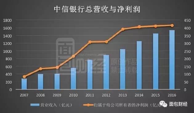 中信银行财报显示:2016年总营收为1537.81亿,同比上涨5.96%;净利润为416.29亿,同比仅上涨1.14%;净利润增速创下近四年来新低。在2013年时,中信银行净利润增速曾高达26.24%。下图为面包财经根据中信银行财报绘制的其总营收与净利润: