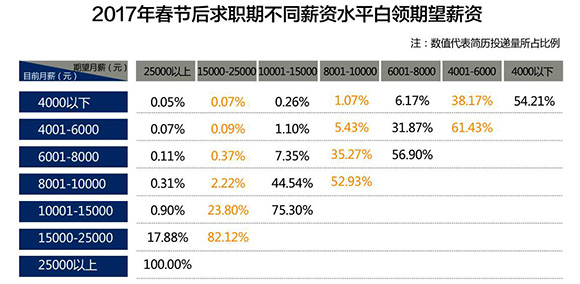 跳槽是提高收入水平行之有效的手段,所以报告中月平均收入在4000元以下的白领跳槽意愿最强烈,所投简历数量占比达30.8%,其次是月平均收入在4001-6000元的白领。跳槽过程中,不同薪酬区间的白领在选择期望薪酬时,更愿意选择比目前月薪高一个层级或基本持平的薪酬。比如,目前月薪在4000元以下的白领,更愿意选择薪水在4000-6000元之间的工作,其占比达到38.17%。