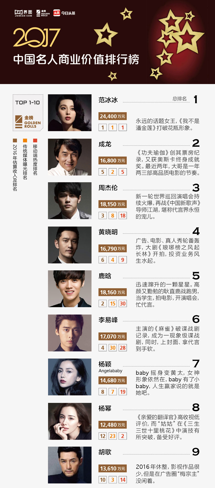 2017中国名人商业价值榜的榜首是“永恒”的“话题女王”范冰冰,无论是收入还是曝光度都名列前茅,新闻头条、活动站台、品牌宣传、秀场、封面哪里都缺不了她的身影,主演《我不是潘金莲》中与其本人形象反差最大的角色,获得了市场的一片赞誉,打破了花瓶形象。