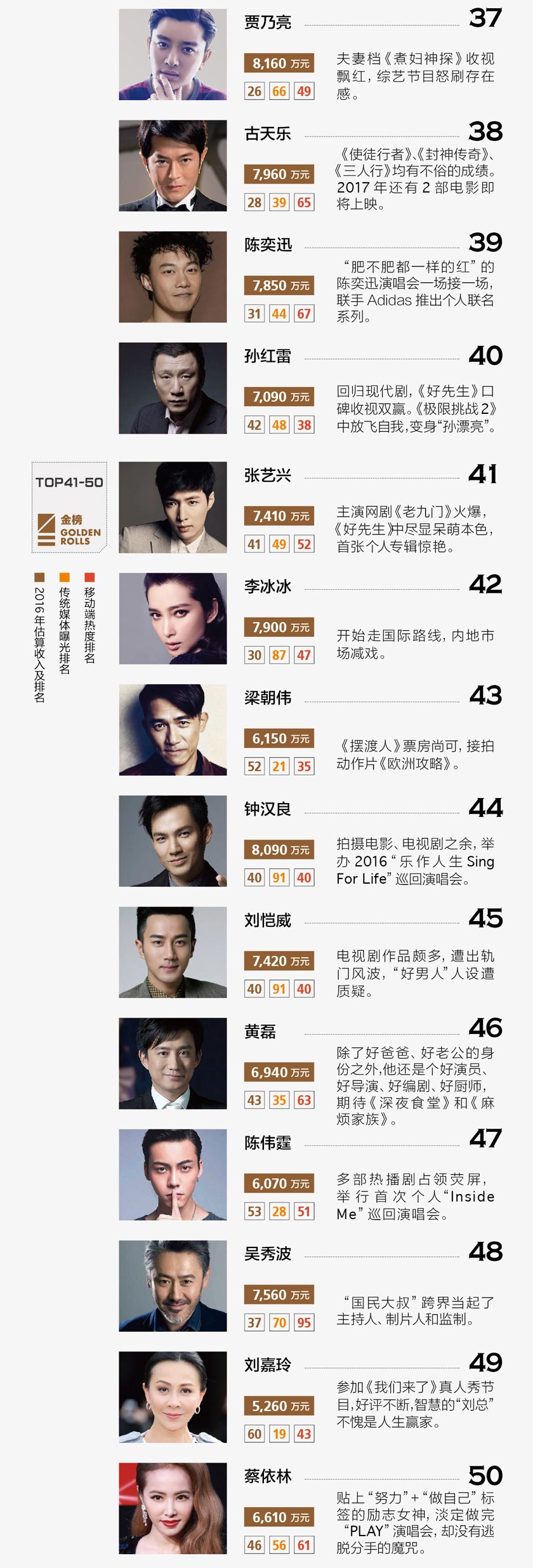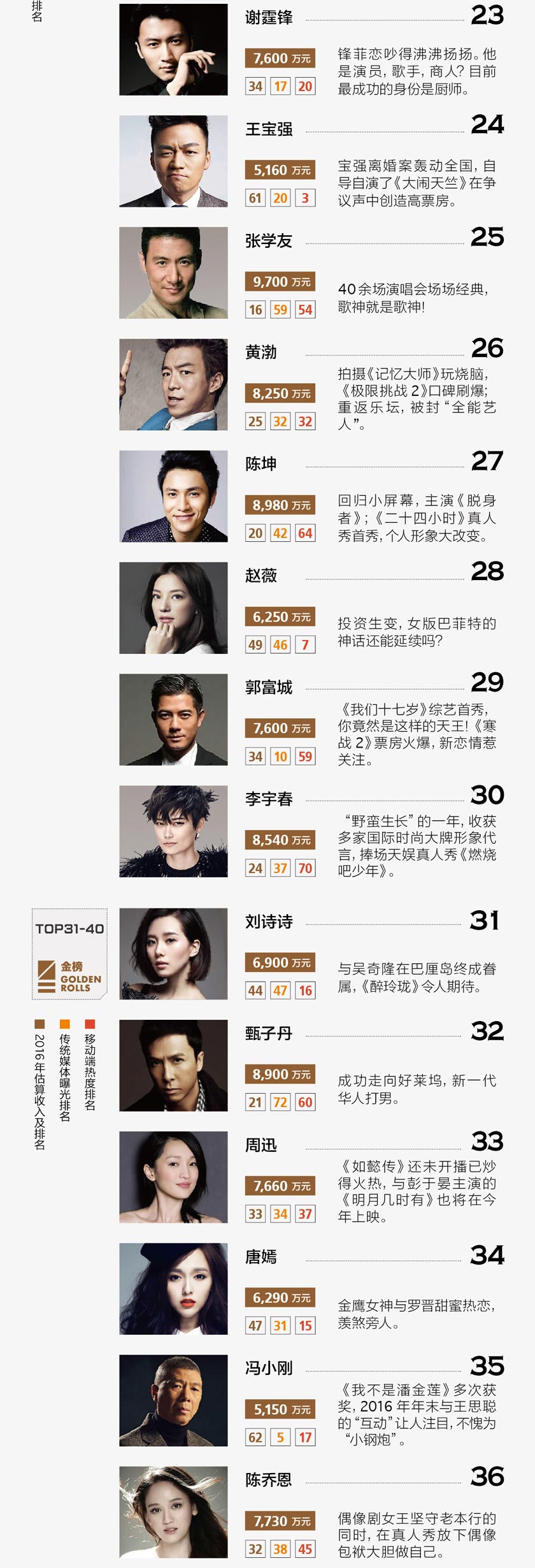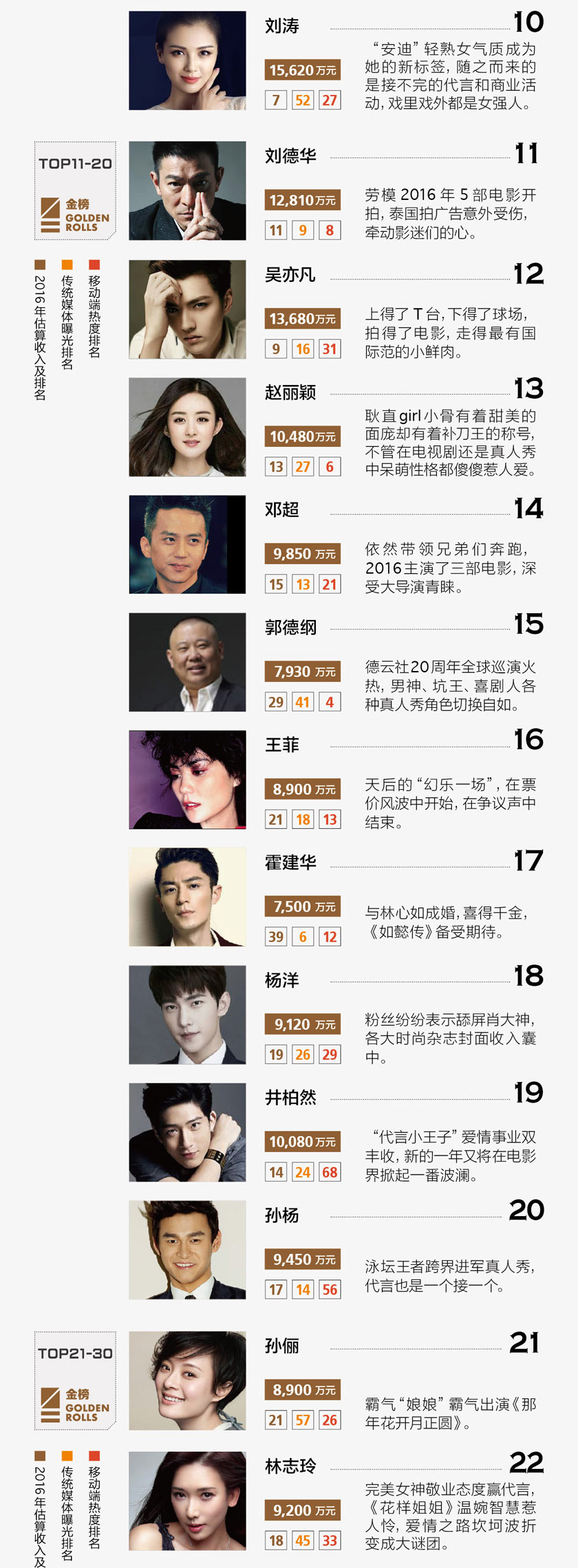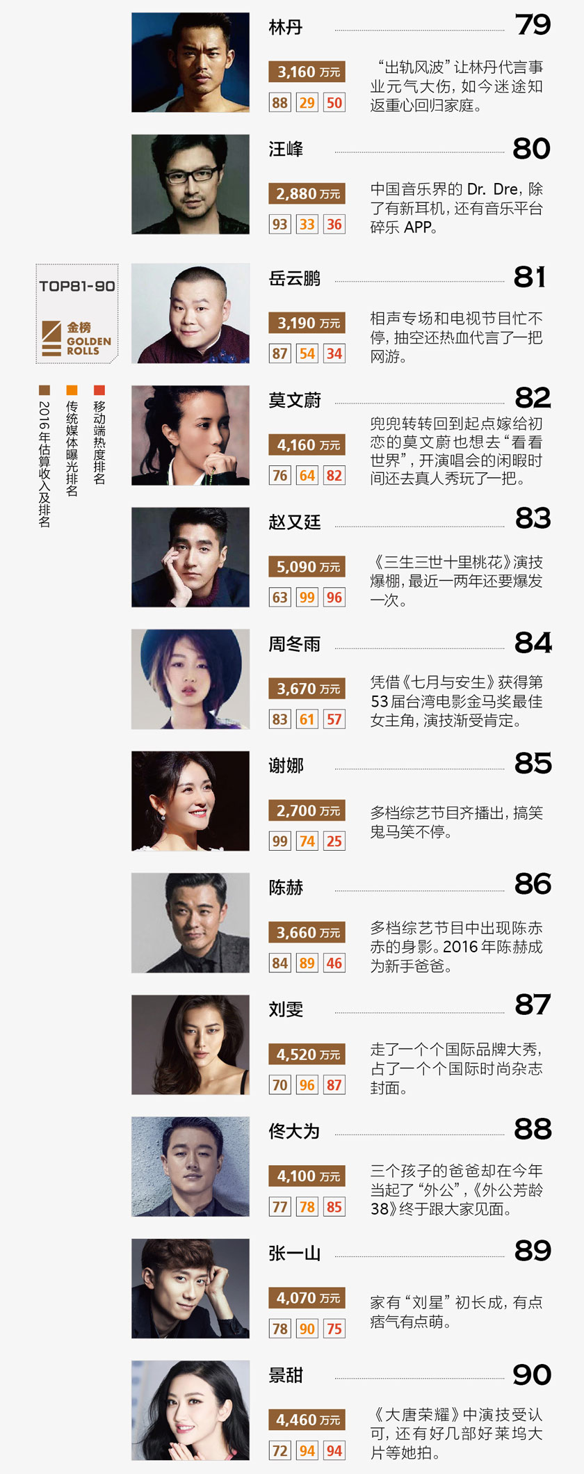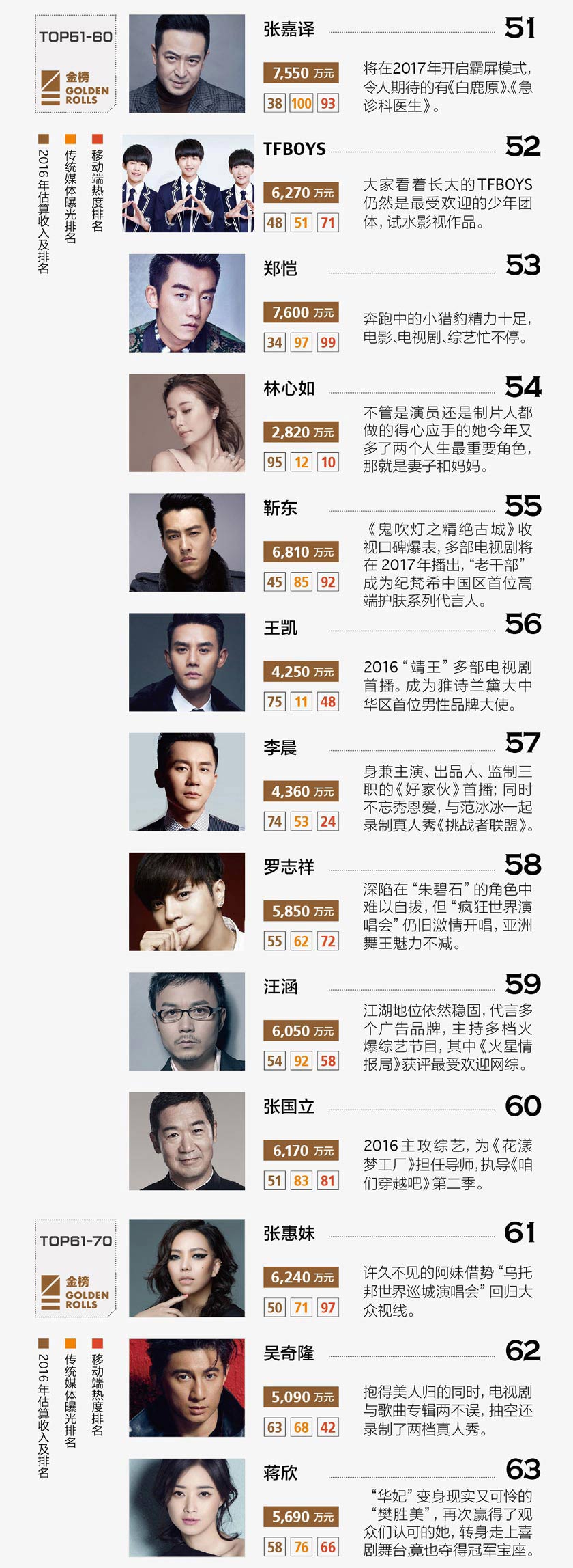 另外,TFBOYS(第52名)是本次榜单中的唯一一个组合。出道时还只是初中生的他们,现在已渐渐长大,综艺活动中露脸颇多,已连续2年登上了春晚的舞台。三个人在歌手的身份下慢慢试水影视剧,2016年接拍了《我们的少年时代》和《超少年密码》两部电视剧,成绩如何还将拭目以待。