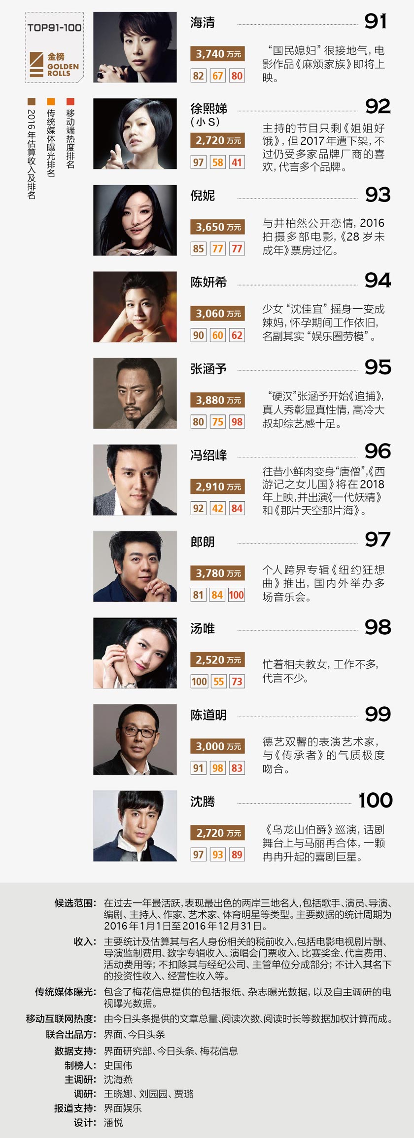 具体而言,界面·头条2017中国名人商业价值榜的考察对象为,在过去一年最活跃,表现最出色的两岸三地名人,包括歌手、演员、导演、编剧、主持人、作家、艺术家、体育明星等类型。中国名人商业价值榜以其2016年度估算收入,传统媒体曝光度,移动互联网热度三项指标综合评价排名。与主要职业相关的收入直观地体现了名人一年来的工作成绩,传统媒体曝光、移动互联网热度则反映了大众和媒体对其的关注度,一定程度上也体现了名人对市场的影响力。最终有100位名人入选。