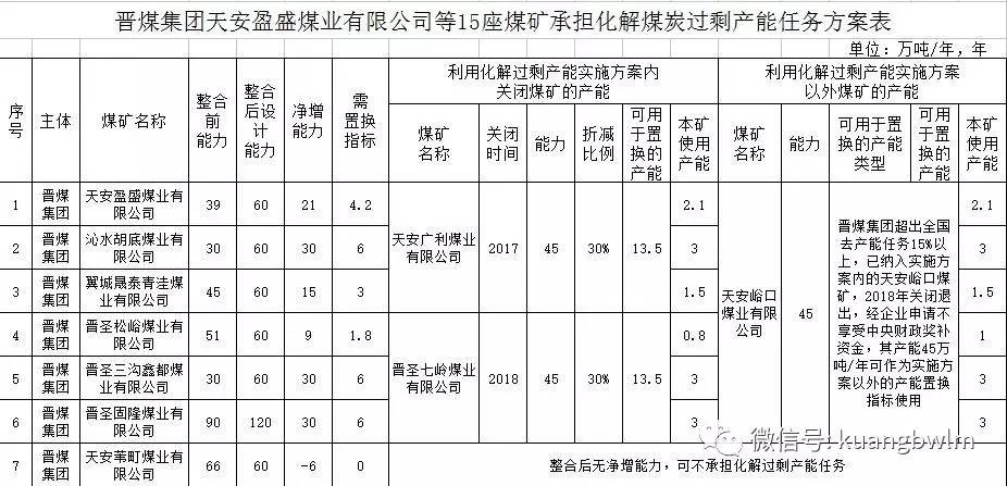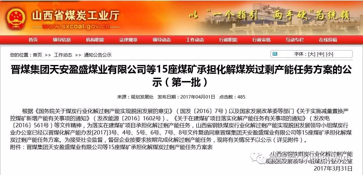 4月1日,山西煤炭厅发布公告称,为落实在建煤矿项目承担化解过剩产能任务,山西省钢铁煤炭行业化解过剩产能实现脱困发展领导小组煤炭行业办公室已经以晋煤化解产能办发[2017]3号、4号、5号、6号、7号、8号文件复函同意晋煤集团天安盈盛煤业有限公司等15座煤矿承担化解煤炭过剩产能任务方案。