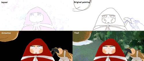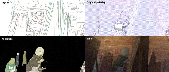 另外是一种不那么常规“动漫”的陈述方式,这不仅大大减少了中期原画动画的加工成本(动画片制作里最耗时耗力的环节),还保留住了想要传达和表现的氛围。