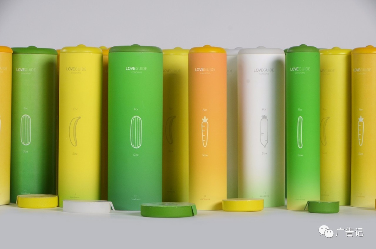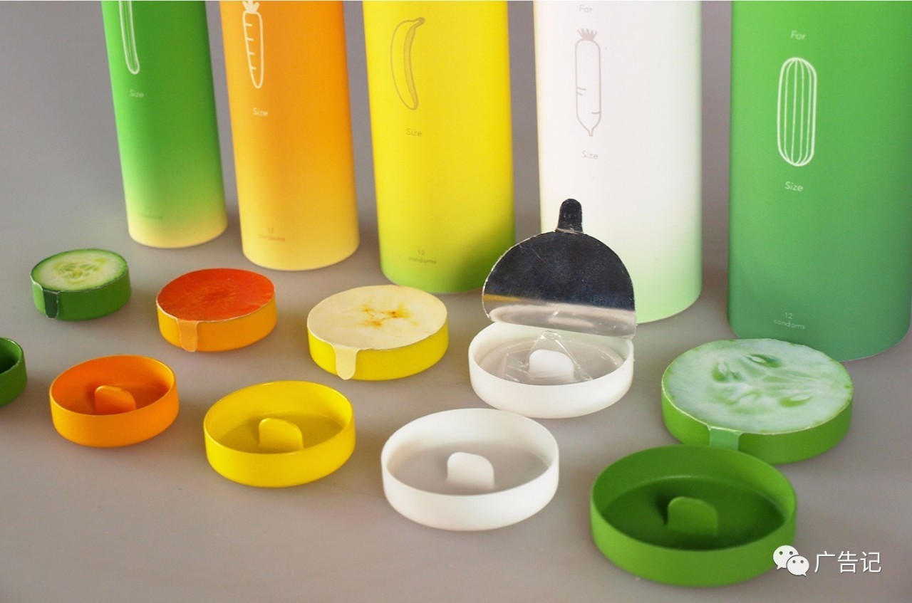 他根据不同的安全套直径,设计出了5种直径的包装盒,并分别用不同的蔬菜(水果)来展示,包括:西葫芦(直径50mm)、萝卜(45mm)、香蕉(40mm)、胡萝卜(35mm)、黄瓜(30mm)。