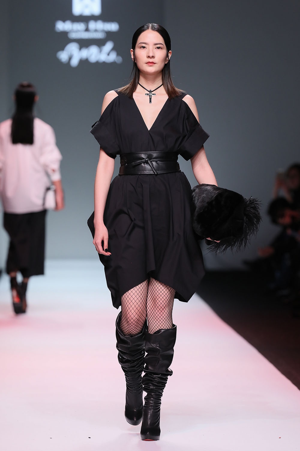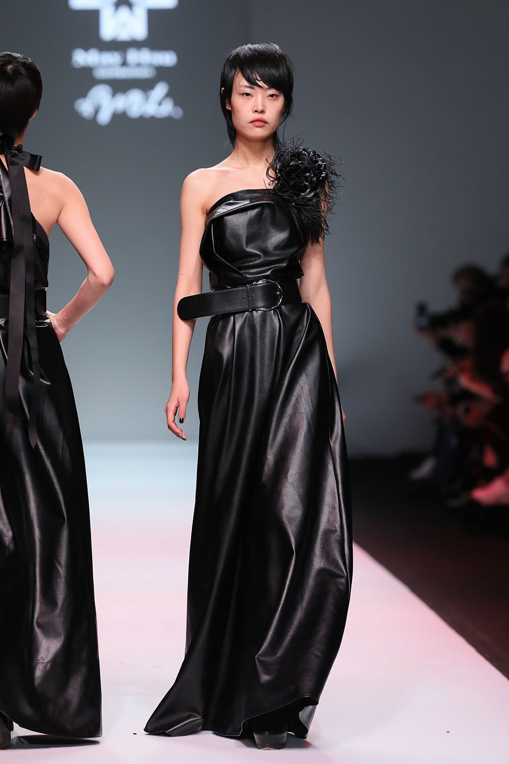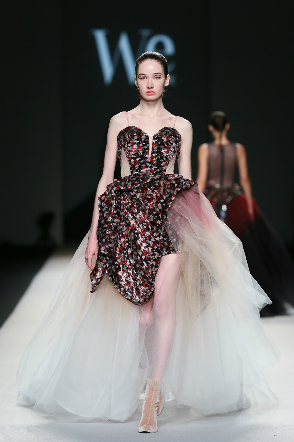台湾设计师徐明美这一季灵感来自于旅行时看到的夕阳下的海景。于是,从海浪延伸出了羽毛装饰,晚霞变成了红色及砖红色在系列中的运用。而设计师过往改良职业装的风格也得以了延续,可以看到西装下“蔓延”出的纱裙,连衣裙因为皮腰包变得有了腰身。