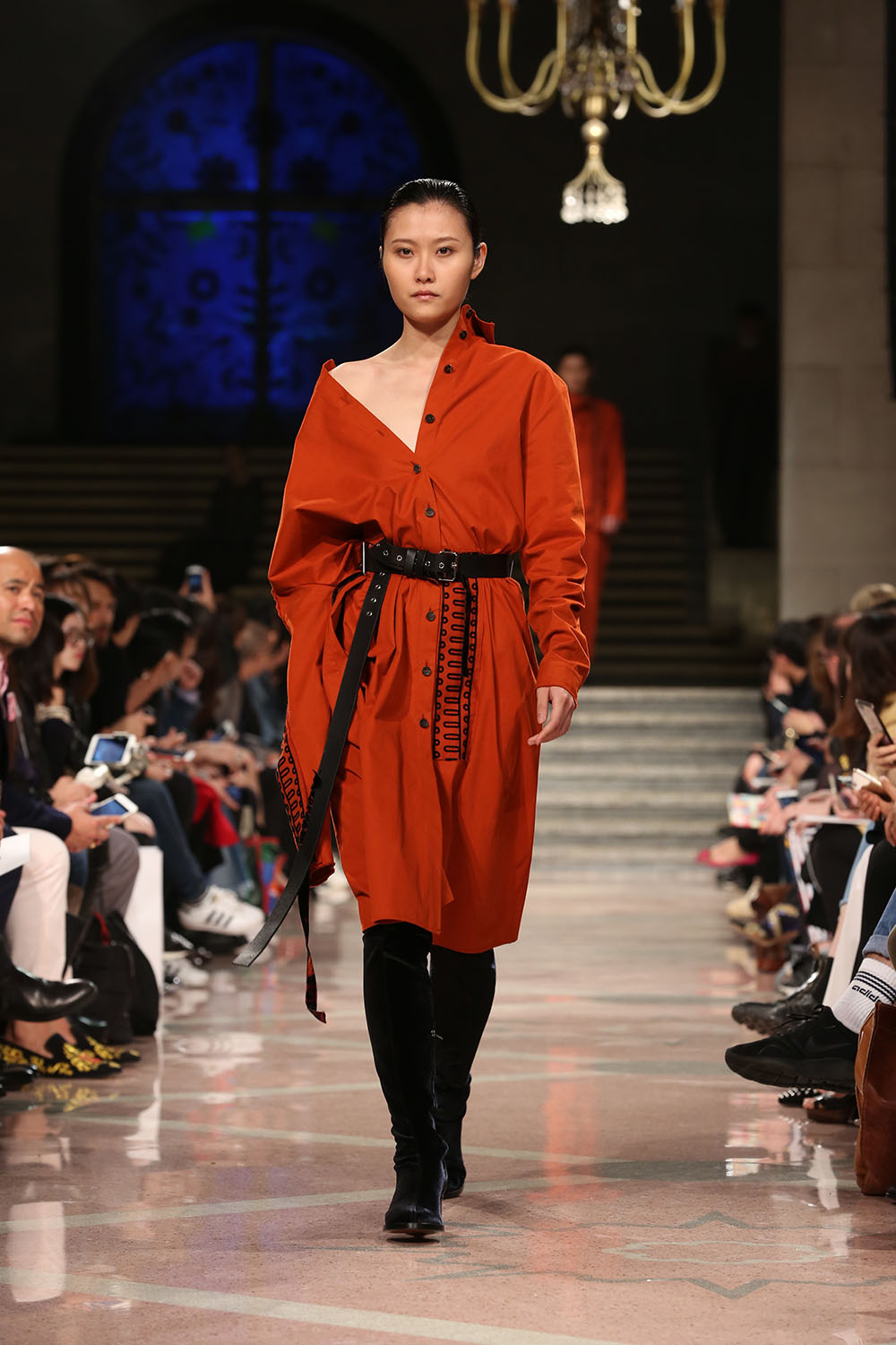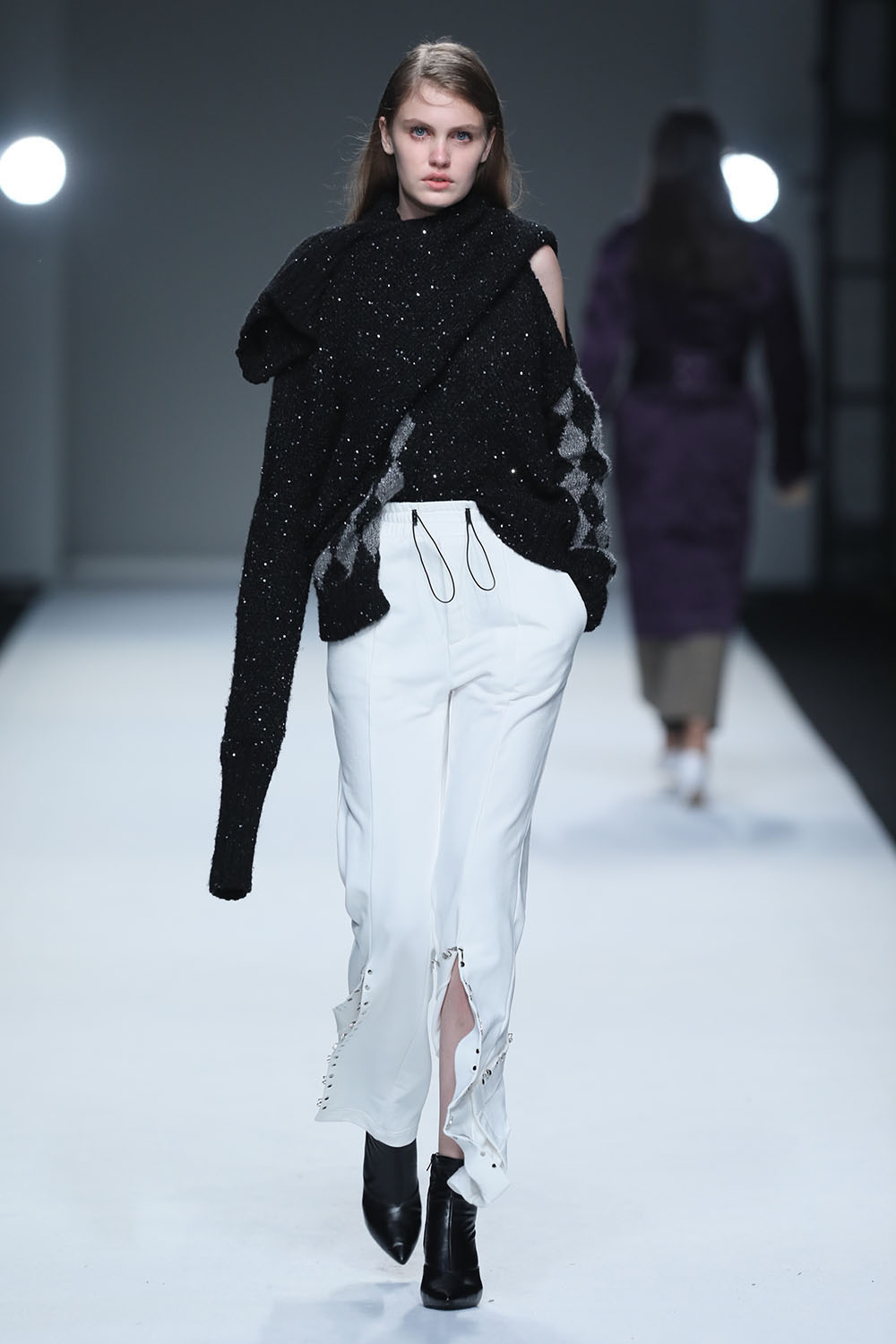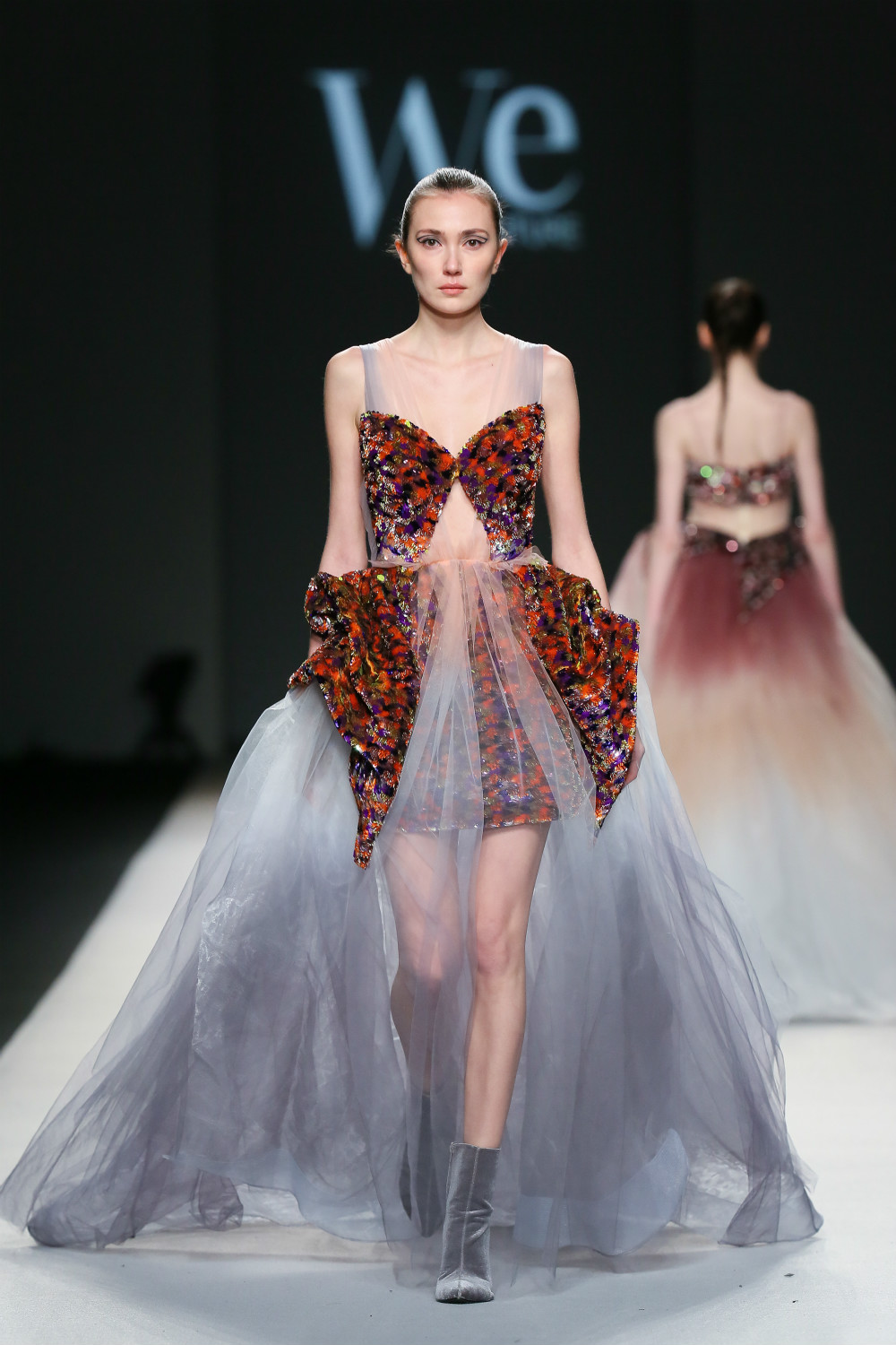 台湾设计师徐明美这一季灵感来自于旅行时看到的夕阳下的海景。于是,从海浪延伸出了羽毛装饰,晚霞变成了红色及砖红色在系列中的运用。而设计师过往改良职业装的风格也得以了延续,可以看到西装下“蔓延”出的纱裙,连衣裙因为皮腰包变得有了腰身。
