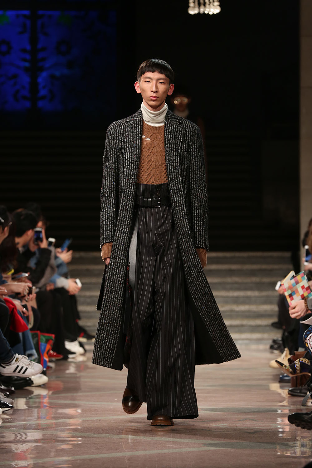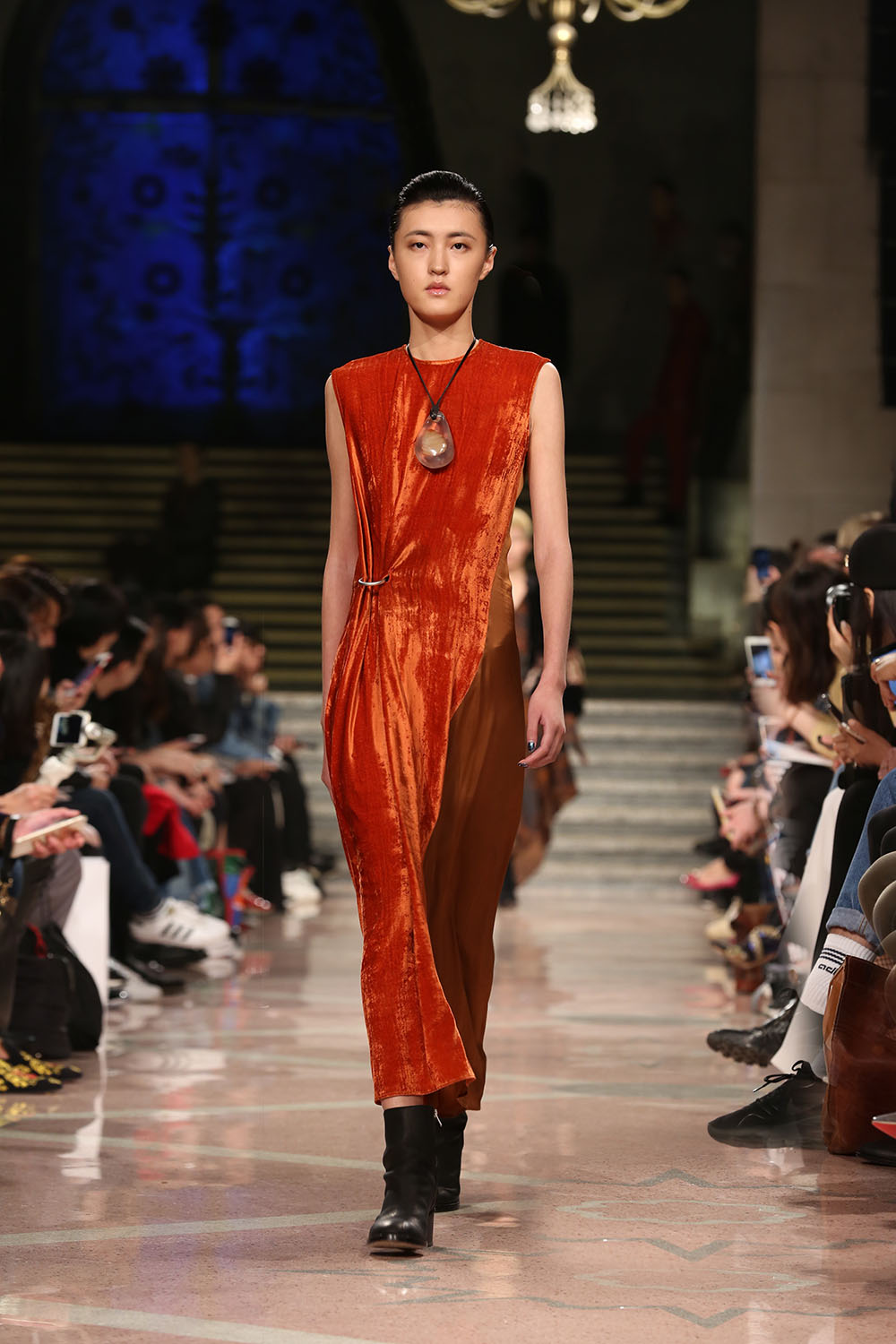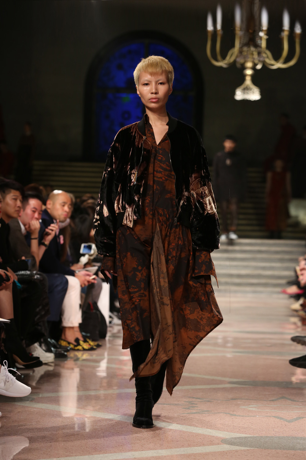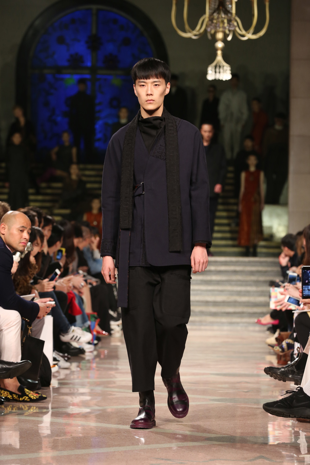 展现在我们眼前的整个系列以大地色系为主。松松垮垮的面料包裹周身,带给人以浓烈的安全私密感。你能在其中看到Damir Doma很多熟悉的配方,例如饰扣、漂白印花和垂坠下来的线头。模特领口、胸前的异域刺绣图案、经过特殊漂白处理的天鹅绒,与和服式的对襟机车夹克散发出丝丝慵懒浪漫的意味。把人们拖回现实的可能是掺杂了些许街头风味的绑带高腰裤、流行了好一阵的绳结和绑带,以及布满大大小小破洞的针织衫。