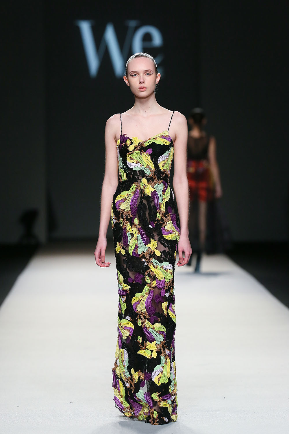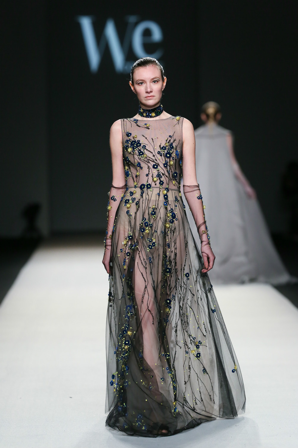 这一季的WECOUTURE虽然是秋冬系列,实际上更像是仲夏夜的一场昆虫聚会。这家以情景式衣服为主打的品牌最擅长的即是手工刺绣,于是自然层叠的叶片、花瓣和藤蔓出现在长裙周身。就连模特手上带着的薄纱手套上也定有大小不一的白色珍珠和刺绣。