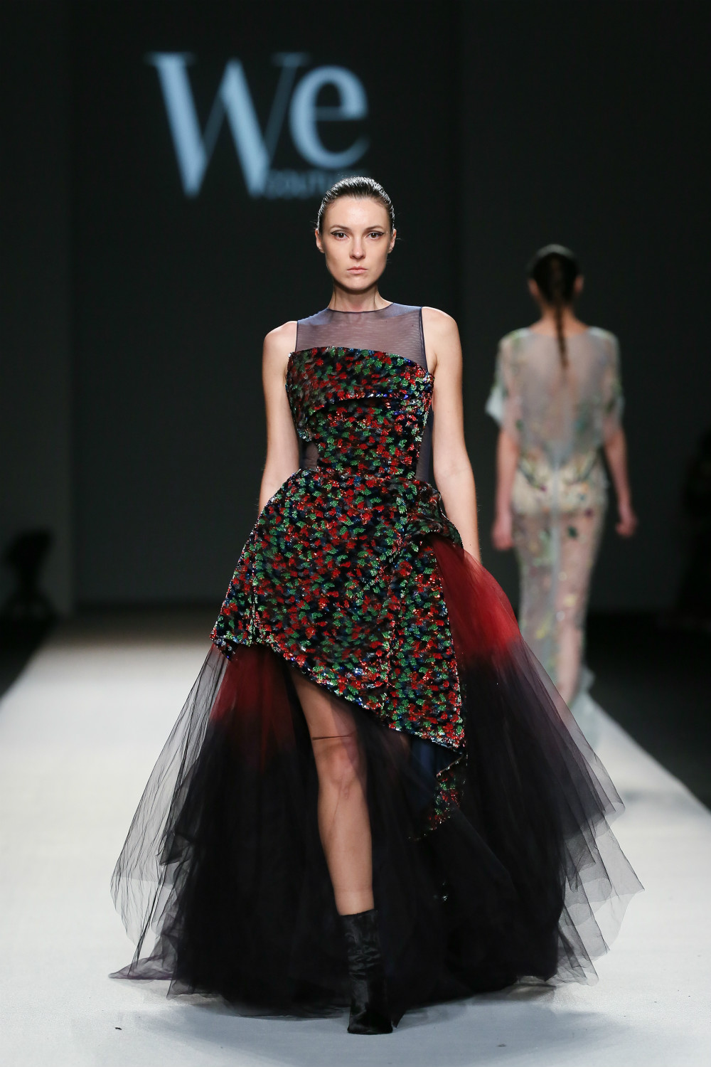 从梦幻生物园这一灵感衍生而出,WECOUTURE的秋冬系列里除了黑白蓝等沉静色调外,还不时闪现出高饱和的芥末黄和橄榄绿,丰富了整个系列的穿着场景。品牌想要吸引年轻女性的想法显而易见,几乎所有模特都梳着干净俏皮的泡泡马尾辫,而不是以往礼服发布秀上常见的盘发。