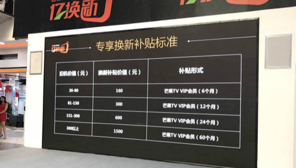 4月13日,爱芒果电视发起以旧换新品牌活动,倡导消费者用废旧的电器置换2-5倍价值的芒果TV会员。