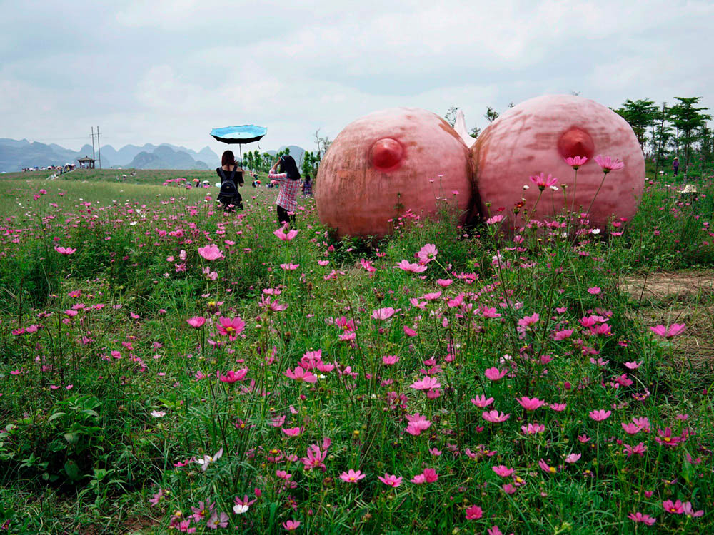 贺肖华:我每到一个城市,都要去几个“典型”的地方游走:步行街、商业中心、最老的广场、最老的公园、市民活动多的草根文化聚集地,有历史遗迹的地方,新修的人造景点等等。与当地人聊天也有“收获”,比如广西来宾市一位跳广场舞的大妈,她就推荐我去了某个人造花园,两千亩的花地里,一对红色的大奶子雕塑。