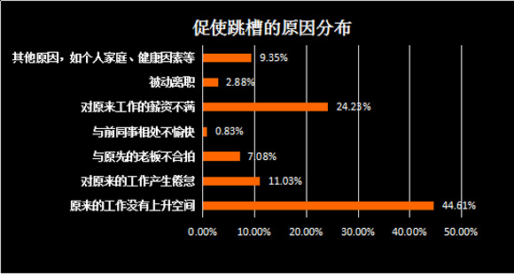 显然,周边人跳槽会扰动心绪,但主要促使人迈出跳槽这一步还是源于其他关键原因。调查显示,职业发展空间甚至超过了薪资,成为职场人决定离职的主要因素。有44.61%的人认为自己跳槽是由于原来的工作没有上升空间;24.23%的人则表示对原来工作的薪资不满意,另有11.03%的人称跳槽主要归因于对原来的工作产生倦怠。
