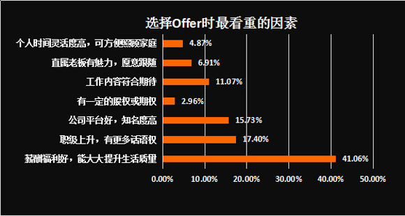 在选择一个新offer时,41.06%的职场人最看重的因素还是“薪酬福利好,能大大提升生活质量”;其次是“职级上升,有更多话语权”(占17.40%)、“公司平台好,知名度高”(占15.73%)、“工作内容符合期待”(占11.07%)等。