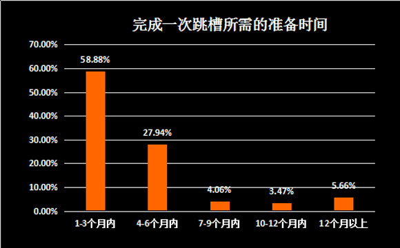从考虑跳槽到最终进入新公司,换工作耗费的时间成本并不小,职场人完成一次跳槽通常需要1到3个月,甚至4到6个月的周期。调查显示,78.65%会采用“骑驴找马”的方式跳槽,他们认为这样比较保险;19.02%的人为了投入更多精力找工作而选择裸辞;一边做兼职、一边找机会的人仅有2.33%。虽然都在想着走,但大多数职场人的离职态度还是不错的。决定跳槽离职时,近八成受访者表示会按规定完成手头的工作交接,给前公司留个好印象;其他人主要会选择与领导协商尽量缩短交接时间,或者等待新的继任者来在离开,马上收东西走人的极少,只有1.32%。