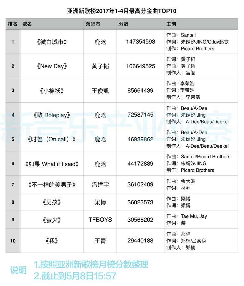 我们整理了亚洲新歌榜2017年1-4月月榜分数最高的前十首歌,如下。