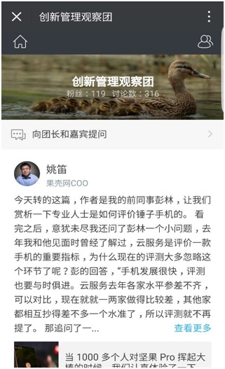 “饭团”还延续了分答的思路,设计了类似的传播者机制。如果有人把你的一篇内容分享出去,非团员想阅读全文就要先支付一元钱。果壳网COO姚笛在自己的饭团还透露了将于近期上线的另一项功能——如果别人因为你分享的内容购买了团员资格,这个收入将会五五分帐。
