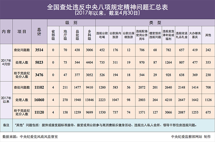 今年4月份,全国共查处违反中央八项规定精神问题3514起,处理5023人,给予党政纪处分3476人。今年以来,全国已查处违反中央八项规定精神问题11102起,处理16060人,给予党政纪处分11120人。