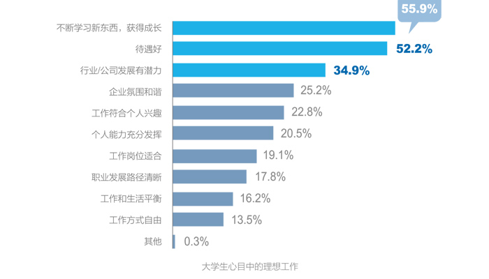 挑选雇主的时候,毕业生们开始懂得长远着眼,对薪酬待遇的要求让位于个人学习机会。调查中有55.9%的学生表示理想的工作是可以“不断学习新东西、获得成长”。另外34.9%的受访者关注行业/公司发展有潜力。