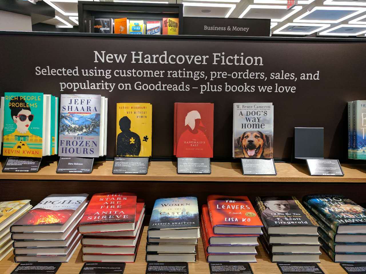 以亚马逊网上书店的藏书量,大于4分,甚至4.5、4.8分的书,都够填满几十个仓库了。但亚马逊实体店的书架,最多也只够摆几千本书。事实上,综合书架上的提示和店员解说,一本书入选的概率至少由以下因素决定:用户评分、预订量、销售额,还有 Goodreads 上的流行程度、作者的名声、亚马逊自己的选择,加上书店所在城市的用户信息等等。