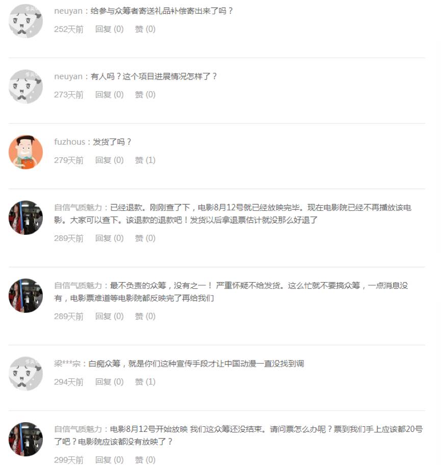 《超能龙骑侠》原本计划去年暑期上映,出品方联合京东金融做了影片周边众筹,参与者可以获得电影票、限量影片衍生品,“并有机会获得上海迪士尼门票大奖”。众筹的金额并不多,所以很快就集齐,不过后来电影临时调档,小娱看了评论,底下的画风是这样的.....