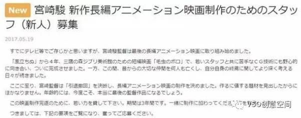5月19日,吉卜力工作室官网宣布,宫崎骏决定撤回隐退宣言,正式复出!同时发布招募信息,为其最新长篇动画的制作招募新人工作人员:“为了完成这次的动画制作,我们需要新鲜血液的注入,制作时间大概在3年左右”。对于今年已经76岁的宫崎骏来说,这真的是最后一部长篇作品了。