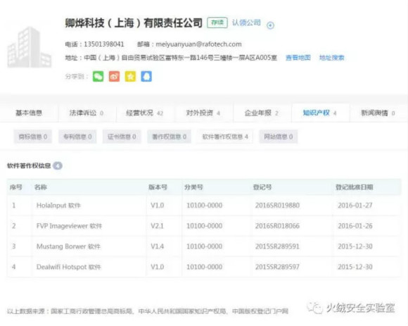 上海卿烨主要负责开发进行流量劫持的浏览器插件和国内外相关网站服务的开发,并且通过对外投资以绝对控股方式控制着北京卿烨,同时设有下属分支公司上海卿烨北京分公司。在该公司产权信息中,我们发现了传播恶意插件的软件,如下图所示: