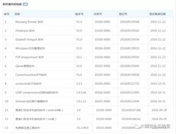 北京卿烨主要负责软件及游戏开发,其开发的软件为劫持流量的传播载体,软件诸如:Deal WiFi、Soso Desktop 和 FVP Imageviewer 等。在该公司产权信息中,我们发现了更多携带流氓推广的软件,如下图所示: