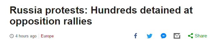 【俄罗斯游行 数百人被拘捕】周一,在莫斯科和圣彼得堡的一次游行中,俄罗斯警方逮捕了数百人。这次游行是由反对派人士纳瓦利内(Alexei Navalny)号召组织,用来表达对政府高层腐败的不满。
