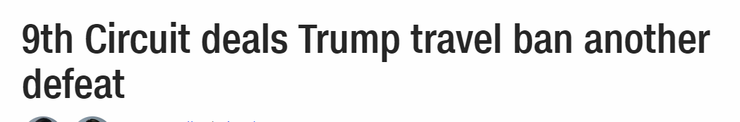 【又一联邦法院裁决特朗普的旅行禁令无效 】周一,美国第九巡回法院的三名法官在推特中似乎回应了特朗普早前发布的有关旅行禁令的推文。