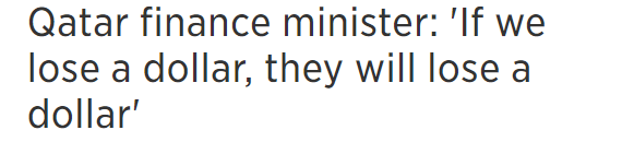 在接受CNBC采访时,卡塔尔财政大臣驳斥了该国害怕经济制裁的说法,同时提醒卡塔尔不会是唯一的受损方,断交国们同样在遭受损失:“我们损失1美元,对方也会损失1美元。”