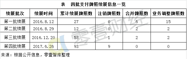 从2016年8月至今,这些支付牌照共经过了四批续展,结果如下: