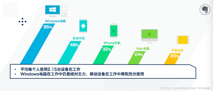 知识工作者在日常工作与生活中,都有机会接触到各种各样的硬件设备及软件工具。随着移动技术不断更新发展,电脑、手机和平板电脑成为他们工作的主要电子设备。多设备同时使用已经成为知识工作者工作中的主流,人均设备数为2.15台。