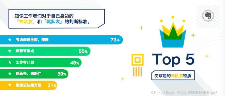 考虑问题全面、清晰的工作伙伴最能得到广大知识工作者的认可。73%的知识工作者表示,最认可的工作伙伴应该拥有考虑问题全面、清晰的特质。
