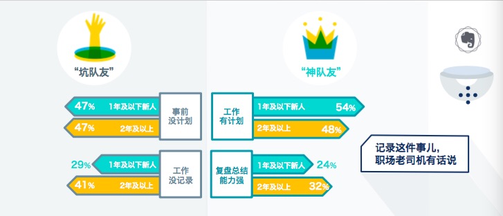 工作时间长和工作时间短的知识工作者,对于工作伙伴的要求不一样。超过半数的工作一年及以下的职场新人表示相较于复盘能力和工作记录,他们更看重工作伙伴事前计划的能力,而工作2年以上的职场老司机则更在意同事复盘总结和工作记录的能力。
