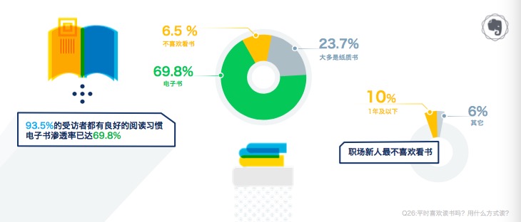 93.5%受访的知识工作者都表示喜欢看书,其中,电子书渗透率已达69.8%。