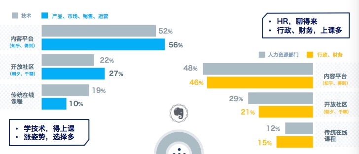 对比课程提供方,在企业职能中,技术部门受访者表示更偏好传统在线课程,而内容平台和开放社区更受产品、市场、销售、运营部门的受访者欢迎。