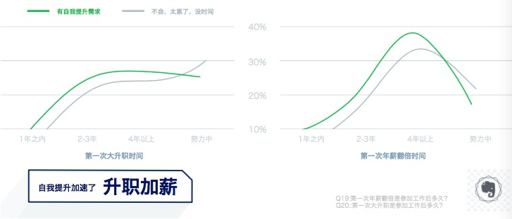 有自我提升愿望并有具体行动的知识工作者对比其他受访者往往可以更快获得升职加薪,而在现实情况中已得到升职加薪的受访者对于课程评价也相对更高。