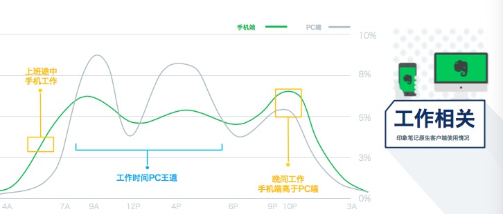 用户使用印象笔记的3个高峰时段为:9AM(上午工作)、2-4PM(下午工作)、晚上8-10PM(加班或夜读)。