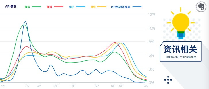 整体来看,早起后上班前的零散时间,用户更倾向于碎片化阅读。而在午休12-2PM和9-12PM晚饭后睡前的整块时间,用户通常选择从知乎、得到这类知识平台进行深度阅读。随着时间变化,我们看到用户将新出现的知识平台上越来越多的内容保存到印象笔记,与此同时,也有些曾经一度很高使用量的API逐渐不再如当初那么活跃。